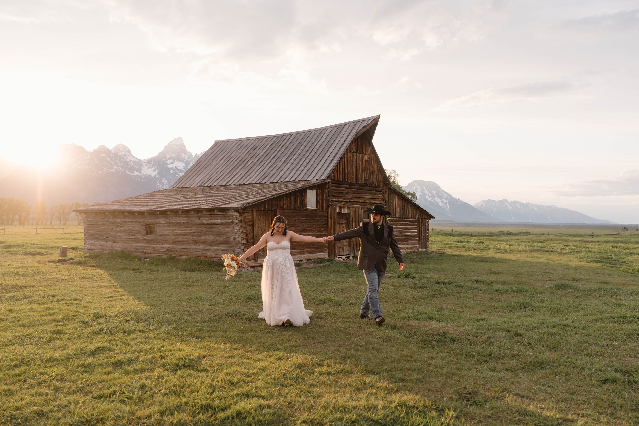 Christian and Ava decided to get married with the most surreal mountain backdrop behind them. The most slow paced, intimate, and joy filled day. They started getting ready separately to ensure a special moment seeing each other for the first time at their first look. We then took photos at a few spots all around Grand Teton National Park before their evening ceremony. They popped champagne once officially married and shared the sweetest hug and kiss! At sunset, they cut their wedding cake and enjoyed the final moments of their wedding day.